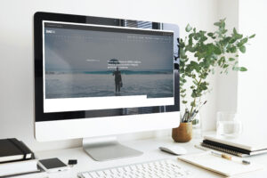 Side view of stylish modern workspace in light room. Generic desktop computer with blank white display with copy space for your design, text, information and advertising content. Nobody around